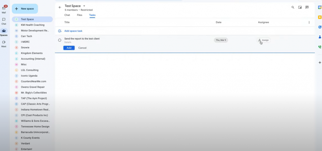 Les fonctionnalités intuitives de Google Tasks facilitent l’attribution facile des tâches aux membres de l’équipe.Par exemple, si vous souhaitez envoyer un rapport à un client, vous pouvez lui attribuer une date d’échéance et le déléguer à un membre spécifique de l’équipe. La conversation sur cette tâche se déroule commodément dans le chat, permettant à tous les membres de l’équipe d’en discuter et de clarifier les doutes éventuels. Cette approche structurée de la conversation favorise une culture d’ouverture et de discussions ciblées sur des tâches particulières, améliorant ainsi la productivité globale de l’équipe.