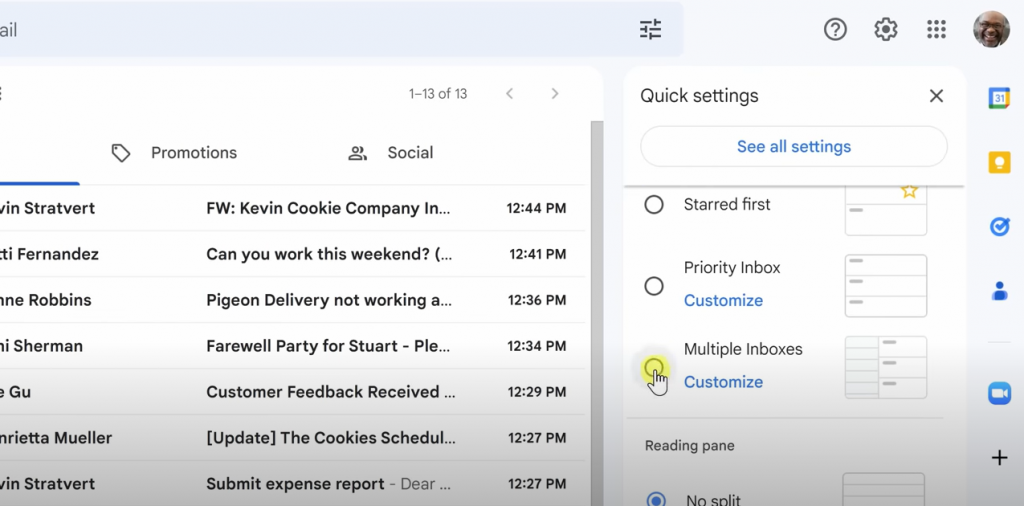 L’un des joyaux cachés de Gmail est la fonctionnalité « Multiple Inboxes ». Cet outil vous permet de diviser votre boîte de réception Gmail traditionnelle à flux unique en sections distinctes, chacune dédiée à une étiquette spécifique. Cette division visuelle de votre boîte de réception apporte un sens de l’ordre et de la structure, faisant de la gestion des e-mails une tâche moins intimidante.