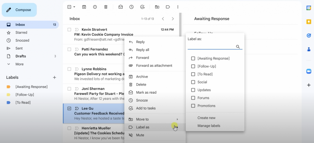 Après avoir défini vos catégories d’e-mails, l’étape suivante consiste à créer des libellés correspondantes dans Gmail. Les libellés agissent comme des dossiers personnalisés dans lesquels vous pouvez regrouper les e-mails associés. Pour notre système, créez des libellés nommées ‘Suivi’, ‘En attente de réponse’ et ‘A lire’. Une astuce astucieuse consiste à inclure des crochets dans vos noms d’libellés, en vous assurant que Gmail les affiche toujours en haut de votre liste de libellés quel que soit l’ordre alphabétique. Cette astuce garantit que vos catégories soient toujours à portée de main.