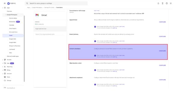 - Go to Apps > Google Workspace > Gmail > Compliance.